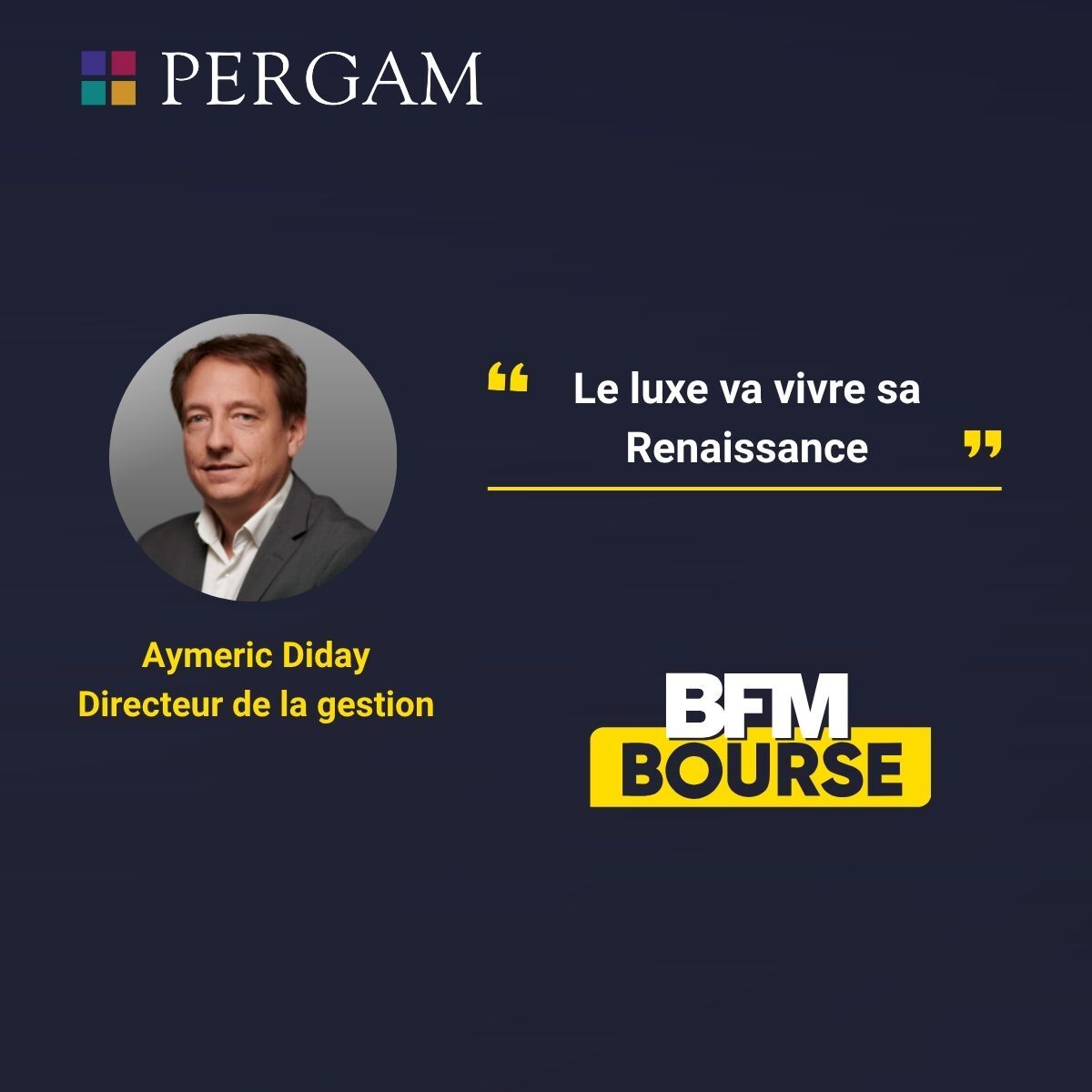 « Le luxe va vivre sa Renaissance » Le 22 octobre, Aymeric Diday, Directeur de la Gestion chez Pergam, était l’invité de l’émission BFM Bourse animée par